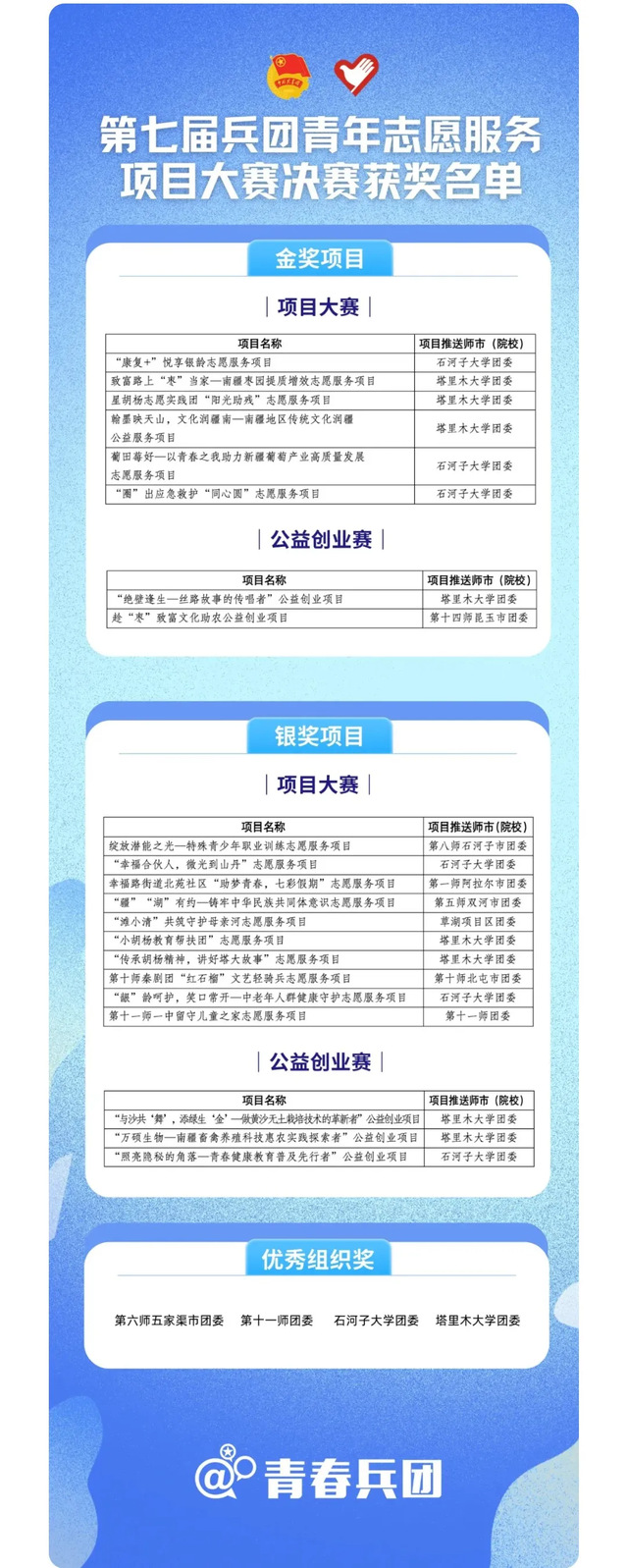 94-5日,第七届兵团青年志愿服务项目大赛决赛暨志愿服务交流会在五家渠市圆满闭幕。探花社区 选送的三个志愿服务项目经过激烈角逐,最终喜获两金一银的优异成绩,展现了探花社区 青年志愿者的卓越风采和专业能力。