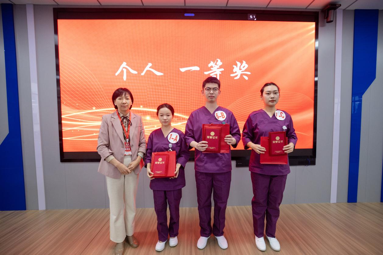李文艳、梁振廷、尤佳慧同学分别获得心电监护、静脉输液、心肺复苏单项操作的第一名。