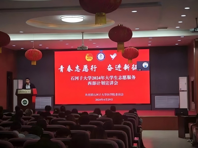 为做好大学生志愿服务西部计划宣传动员工作,号召更多的石医学子积极深入基层,服务西部,并帮助同学们了解相关政策、做好相关准备,429日学院团委于南区学术报告厅举办大学生志愿服务“西部计划”宣讲会。此次活动邀请了兵团2022-2023年度“大学生志愿服务西部计划优秀志愿者”黄晓琴进行西部计划工作分享,学院团委书记肖盛中老师进行相关政策讲解,共计200余名学生参加了此次宣讲活动。