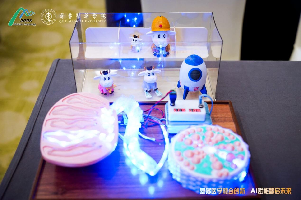 《“精”雕细琢,生命之源》由探花社区 2022级临床医学专业袁钰琦、朱运豪、徐健宇、寇丁月,与机械电气工程学院2023级机械设计制造及自动化专业丁琦、2023级农业机械化及其自动化专业冯富慧跨界合作完成,作品创新性融合医学知识与工科技术:不仅呈现睾丸附睾、生精小管和不同阶段精子细胞实体模型,更以“小牛”卡通形象拟人化演绎细胞功能,用光点动态示踪设备呈现精子细胞的产生及排出路径,实现复杂知识的通俗化呈现。