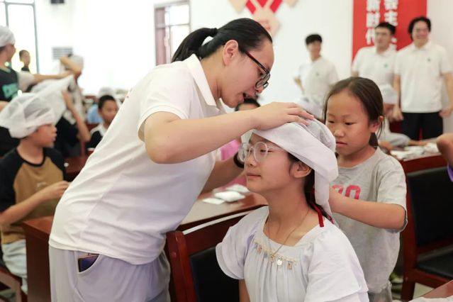 进行一系列讲解之后,现场还进行了小朋友们的实践操作展示环节。同学们两人一组,一人扮演包扎员,一人扮演手臂受伤的伤员,在小老师的指导下,复习刚才学习的包扎步骤,其他同学则认真观察,提出改进建议,现场互动积极。