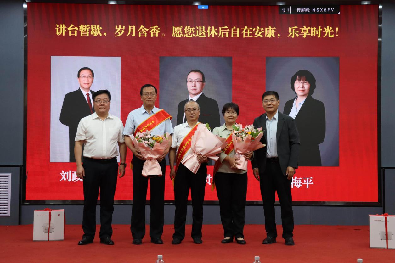 2025年上半年在教育教学、科学研究、管理服务等方面取得优异成绩的获奖教师名单,学院领导为获奖者颁发了荣誉。随后,党委书记张青为银龄教师献上鲜花,感谢他们不远万里支援西部教育,将宝贵经验和智慧倾囊相授,为学院发展注入了强劲动力。