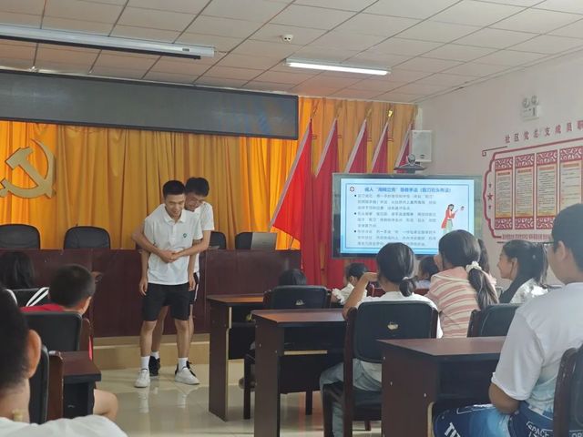 接下来是关于心肺复苏的科普时间,团队成员从评估现场环境开始讲起,随后是检查患者的意识和呼吸,通过拍打肩膀呼喊和观察胸部起伏来判断;再到胸外按压的具体要点:按压位置、按压深度以及按压频率等;之后是开放气道的“仰头提颏法”以及人工通气时的注意事项。每一个步骤,团队成员都进行了细致的演示和讲解,为孩子们在突发情况时提供了安全可靠的行动指南。