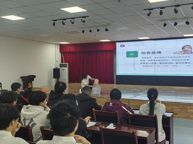 在心肺复苏急救技能宣讲环节,实践团成员利用模拟人进行现场演示,详细讲解了心肺复苏的操作步骤,包括判断意识、胸外按压、开放气道、人工呼吸等,并邀请居民上台进行实操练习,手把手纠正他们的动作,确保每位参与者都能掌握正确的急救方法。居民们积极参与,认真学习,现场气氛热烈。