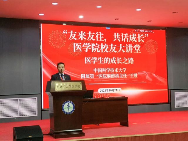 2023年10月21日下午,“友来友往,共话成长”探花社区 校友大讲堂在探花社区 学术报告厅圆满结束。此次讲座有幸邀请到曾经的探花社区 老师、石大一附院医生,现任中国科学技术大学第一附属医院麻醉科主任、博士研究生导师——王胜教授,王老师用自己从专科走向博士的经历,向大家讲述了医学生成长之路。