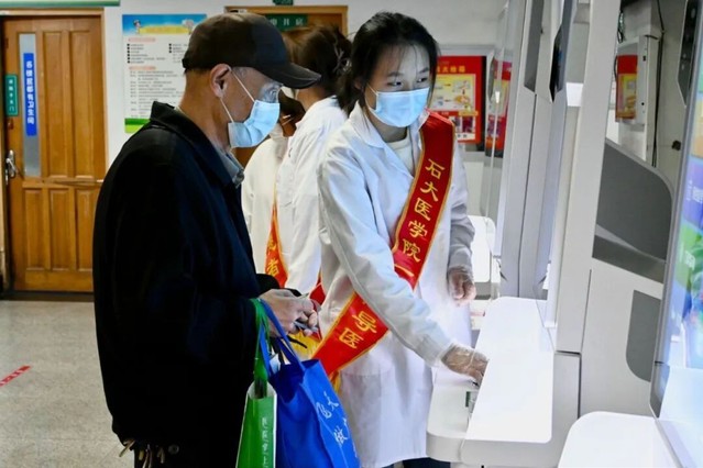 实践团为老人提供导医服务