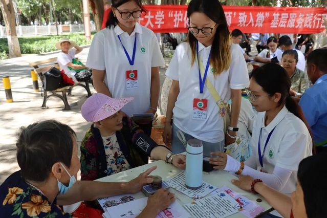 图为实践团在第三师御景苑社区广场配合卫生员做宫颈癌认知调研及提供健康测血压服务