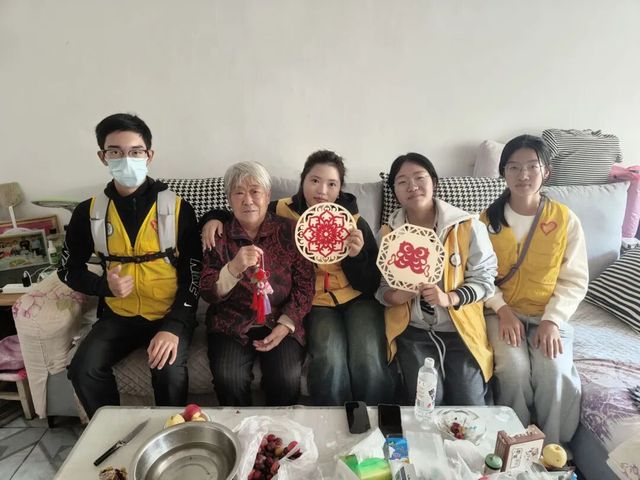 中秋节当天,志愿者们带着亲手制作的手工艺品,更怀揣着满满的诚意来到 26 社区。他们轻步走进独居老人家中,与老人们亲切交流。志愿者们将手工制品送到老人手中,那精致的中国结似红色的精灵,剪纸作品如灵动的画卷,香包散发着沁人的幽香,瞬间为老人的居室增添了节日的氛围。老人们捧着这些饱含心意的手作,脸上漾起喜悦的笑容,与志愿者们唠着家常,回忆往昔岁月,房间里满是欢声笑语,温馨的氛围弥漫在每一个角落。一位独居老奶奶轻轻抚摸着志愿者送来的中国结,眼中满是感动:“孩子们能来陪我,还带来这么好看的东西,这个中秋,我心里头亮堂又暖和。”