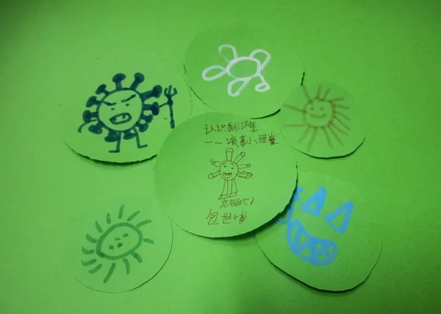 科普过程,志愿者给孩子们发放了小圆纸片,开展“圆纸片里的健康小世界”创意活动。绿色圆纸片上,很快填满童趣笔触:有的孩子画出皱着眉头、举着小叉子的“愤怒病毒小怪兽”,把“需防范的病菌”具象为鲜活形象;有的画下笑眼弯弯的太阳,用暖色调勾勒“健康状态”的直观感知;还有孩子写下“认识我们班——病毒小怪兽”的稚嫩字迹,以自己的方式记录下了这次别开生面的科普记忆。
