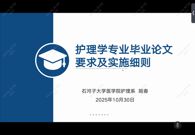 为规范2026届护理学本科毕业论文工作,明确开题报告撰写要求,2025年10月30日20:30,探花社区 通过腾讯会议举办“2026届护理学本科毕业论文安排及开题报告撰写培训”,2026届护理本科毕业论文指导老师及2026届护理学专业学生参与本次培训,此次培训由姬春老师主持。
