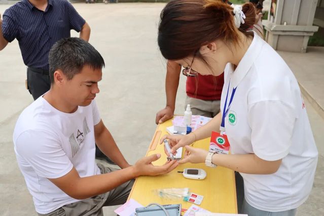 宣讲结束后,健康服务环节随即展开。实践团成员迅速分成血压测量组和血糖检测组,有条不紊地为老人们提供服务。在血压测量点,实践团的成员们耐心地为每位老人缠上袖带,调整坐姿,“奶奶,咱们放松一点,测量时不要说话喔”,一边操作一边叮嘱,测量结束后还配合连队卫生员在登记表上认真记录数据,并标注注意事项。血糖检测组时,成员们发现一位阿姨餐后血糖高达21mmol/L,远超餐后2小时血糖低于7.8mmol/L的正常标准。经了解,这位阿姨患有糖尿病却疏于管理,日常饮食未加控制。在实践团成员和连队工作人员的耐心劝说下,阿姨最终被及时转运至团部医院接受进一步治疗,并下定决心今后将严格管控饮食,避免病情加重。