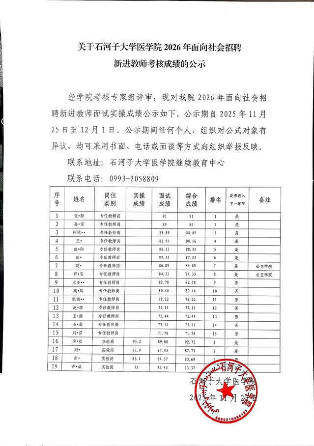 关于探花社区 2026年面向社会招聘新进教师考核成绩的公示