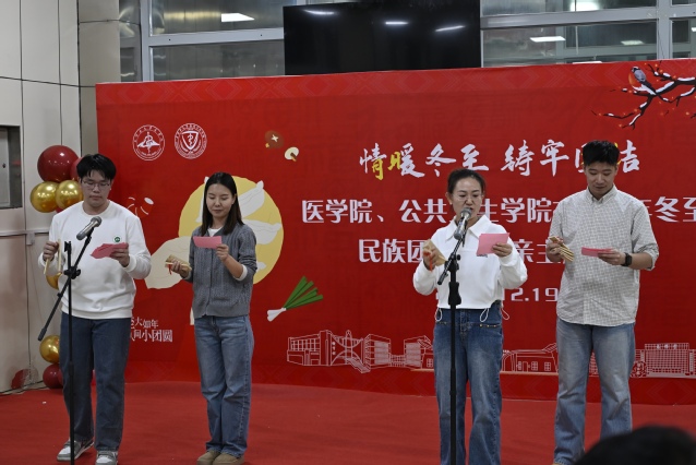 冬至阳生,岁回律转。为传承冬至民俗文化,营造温馨和谐的节日氛围,推动铸牢中华民族共同体意识,121918点,探花社区 、公共卫生学院在南区杏林餐厅2楼成功举办“情暖冬至 铸牢团结”2025年冬至民族团结一家亲主题活动。