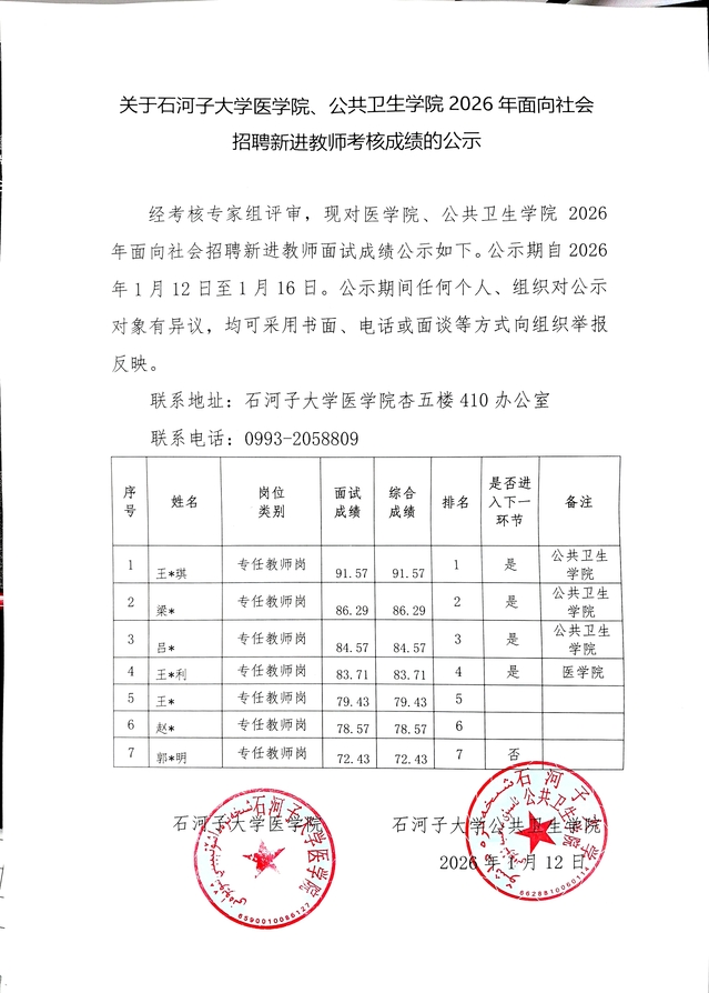 关于探花社区 、公共卫生学院2026年面向社会招聘新进教师考核成绩的公示