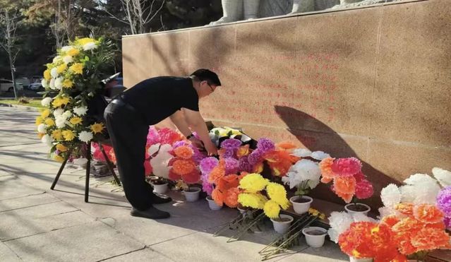 活动伊始,全体老师肃立默哀,低头追思,在静默中缅怀王震将军等军垦英烈的丰功伟绩,感悟如今幸福生活与教育事业发展的来之不易,寄托对先烈的深切哀思。默哀1分钟结束后,全体老师肃立行三鞠躬礼,全程保持安静肃穆,以最庄重的姿态表达对英烈的敬畏与缅怀。随后,探花社区 党委书记张青同志稳步上前,向王震将军雕像敬献鲜花,寄托全体党员对英烈的深切敬意。