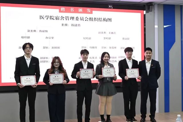表彰环节结束后,换届聘任仪式正式开始。现场宣读了新一届宿管会任职名单。朱伟娟老师为宿管会主席团颁发聘书,刘蒙恩老师为各部门部长颁发聘书。一纸聘书既是认可与肯定,更是责任与期许,新一届成员们表示将以热忱守护宿舍阵地,传递校园温情。